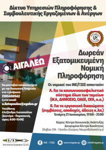 Στο πλαίσιο αυτό, ο Δήμος Αιγάλεω, σε συνεργασία με το Ινστιτούτο Εργασίας της ΓΣΕΕ (ΙΝΕ – ΓΣΕΕ), προχωρά στη διοργάνωση νέας συνάντησης, προσφέροντας σε εργαζόμενους, ανέργους και συνταξιούχους τη δυνατότητα δωρεάν πρόσβασης σε έγκυρη και εξειδικευμένη νομική υποστήριξη.