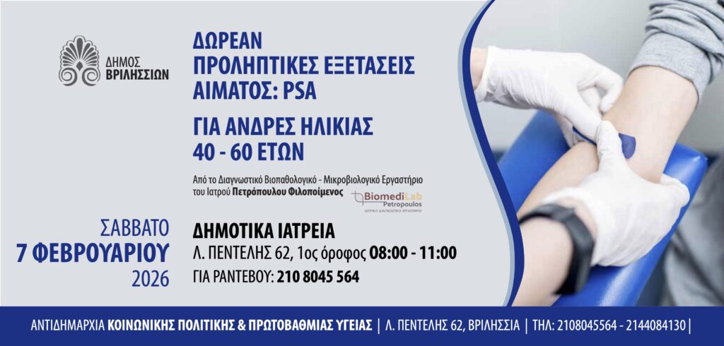 Ο Δήμος Βριλησσίων, μέσω της Αντιδημαρχίας Κοινωνικής Πολιτικής & Πρωτοβάθμιας Υγείας, διοργανώνει δράση δωρεάν προληπτικών εξετάσεων αίματος PSA για άνδρες ηλικίας 40 έως 60 ετών, στο πλαίσιο της ενίσχυσης της πρόληψης και της έγκαιρης διάγνωσης.