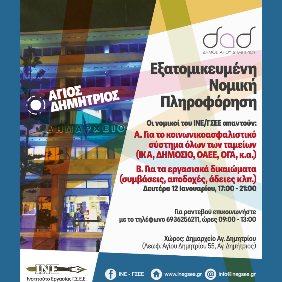 Σε συνεργασία του Δήμου Αγίου Δημητρίου με το Ινστιτούτο Εργασίας της ΓΣΕΕ, παρέχεται η δυνατότητα παροχής υπηρεσιών συμβουλευτικής και πληροφόρησης σε καίρια θέματα που απασχολούν μεγάλη μερίδα των πολιτών και ειδικότερα, σε ζητήματα: