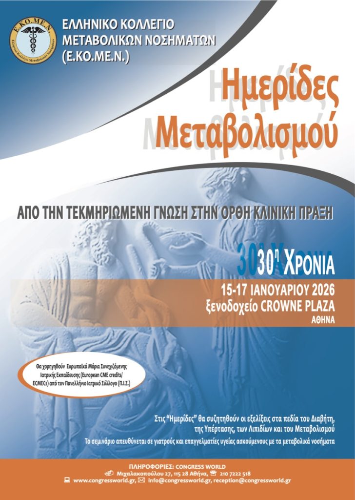 ΚεντρικήΚοινωνικάΗμερίδες Μεταβολισμού: Από την Τεκμηριωμένη Γνώση στην Ορθή Κλινική Πράξη by xristiana1 Ιανουαρίου 20262 Ιανουαρίου 2026054 Share00 1/1/2026 Πηγή: https://congressworld.gr