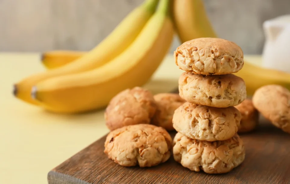 - Σε ένα ξεχωριστό μπολ, ανακατέψτε τις πολτοποιημένες μπανάνες και τη μαγειρική σόδα. Αφήστε το μείγμα να δράσει για 2 λεπτά. Η μαγειρική σόδα θα αντιδράσει με το οξύ στις μπανάνες, το οποίο με τη σειρά του θα δώσει στα μπισκότα την αφράτη όψη τους.