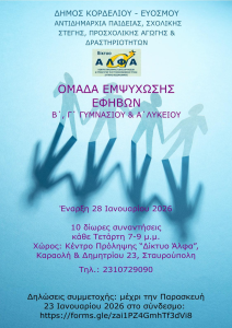 Αναγνωρίζοντας αυτές τις ανάγκες, ο Δήμος Κορδελιού – Ευόσμου, μέσω της Αντιδημαρχίας Παιδείας, Σχολικής Στέγης, Προσχολικής Αγωγής και Δραστηριοτήτων, σε συνεργασία με το Κέντρο Πρόληψης “Δίκτυο Άλφα”, διοργανώνει μια ειδική Ομάδα Εμψύχωσης Εφήβων.