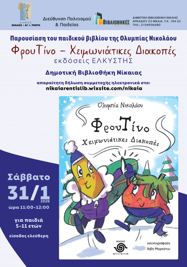 Η Δημοτική Βιβλιοθήκη Νίκαιας προσκαλεί μικρούς και μεγάλους στην παρουσίαση του βιβλίου της Ολυμπίας Νικολάου «ΦρουΤίνο, χειμωνιάτικες διακοπές», από τις εκδόσεις ΕΛΚΥΣΤΗΣ.