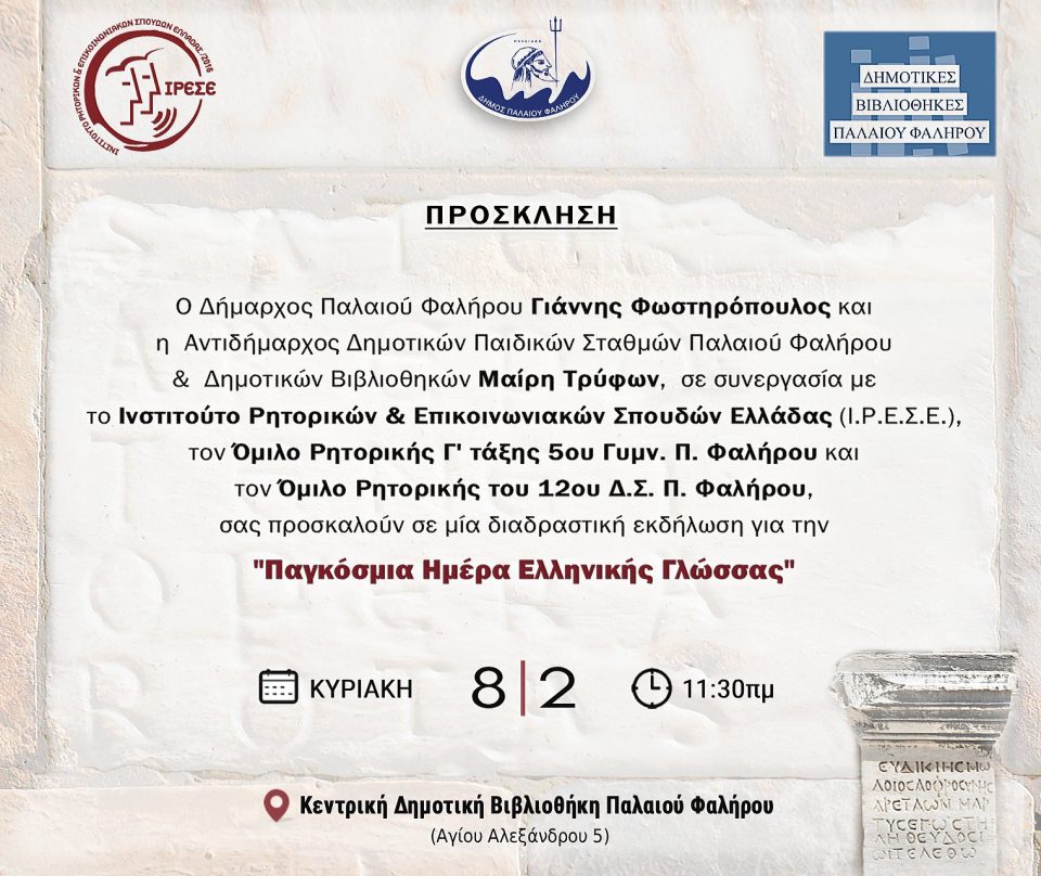 Ο Δήμαρχος Π. Φαλήρου Γιάννης Φωστηρόπουλος και η Αντιδήμαρχος Δημοτικών Παιδικών Σταθμών Π. Φαλήρου & Δημοτικών Βιβλιοθηκών Μαίρη Τρύφων, σε συνεργασία με το Ινστιτούτο Ρητορικών & Επικοινωνιακών Σπουδών Ελλάδας (ΙΡΕΣΕ), τον Όμιλο Ρητορικής Γ’ τάξης 5ου Γυμν. Π. Φαλήρου και τον Όμιλο Ρητορικής του 12ου Δ.Σ. Π. Φαλήρου, σας προσκαλούν σε μία δια-δραστική εκδήλωση για την “Παγκόσμια Ημέρα Ελληνικής Γλώσσας“.