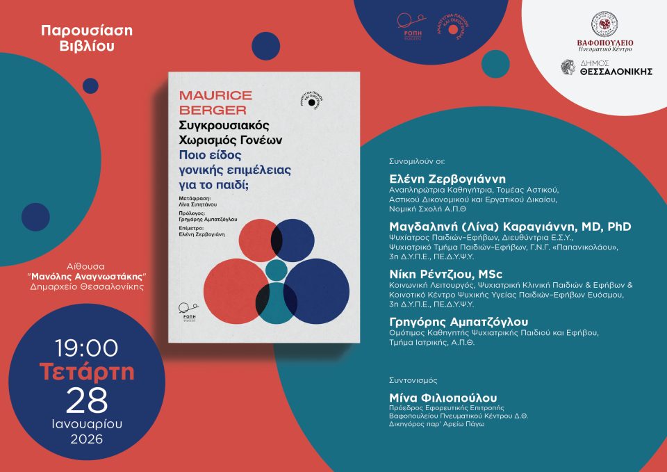 Παρουσίαση του μεταφρασμένου βιβλίου του διακεκριμένου Γάλλου παιδοψυχιάτρου Maurice Berger με τίτλο «Συγκρουσιακός Χωρισμός Γονέων: Ποιο είδος γονικής επιμέλειας για το παιδί;», διοργανώνει το Βαφοπούλειο Πνευματικό Κέντρο σε συνεργασία με τις εκδόσεις ΡΟΠΗ, την Τετάρτη 28 Ιανουαρίου 2026, στις 19:00, στην αίθουσα «Μανόλης Αναγνωστάκης» (Δημαρχείο Θεσσαλονίκης, Βασ. Γεωργίου Α΄1).