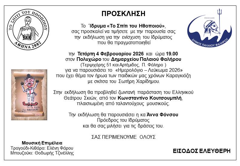 Η πρόσκληση αφορά σε μία φιλανθρωπική εκδήλωση του Ιδρύματος «Το Σπίτι του Ηθοποιού», η οποία θα πραγματοποιηθεί την Τετάρτη 4 Φεβρουαρίου 2026, στις 19:00, στον Πολυχώρο του Δημαρχείου Παλαιού Φαλήρου.