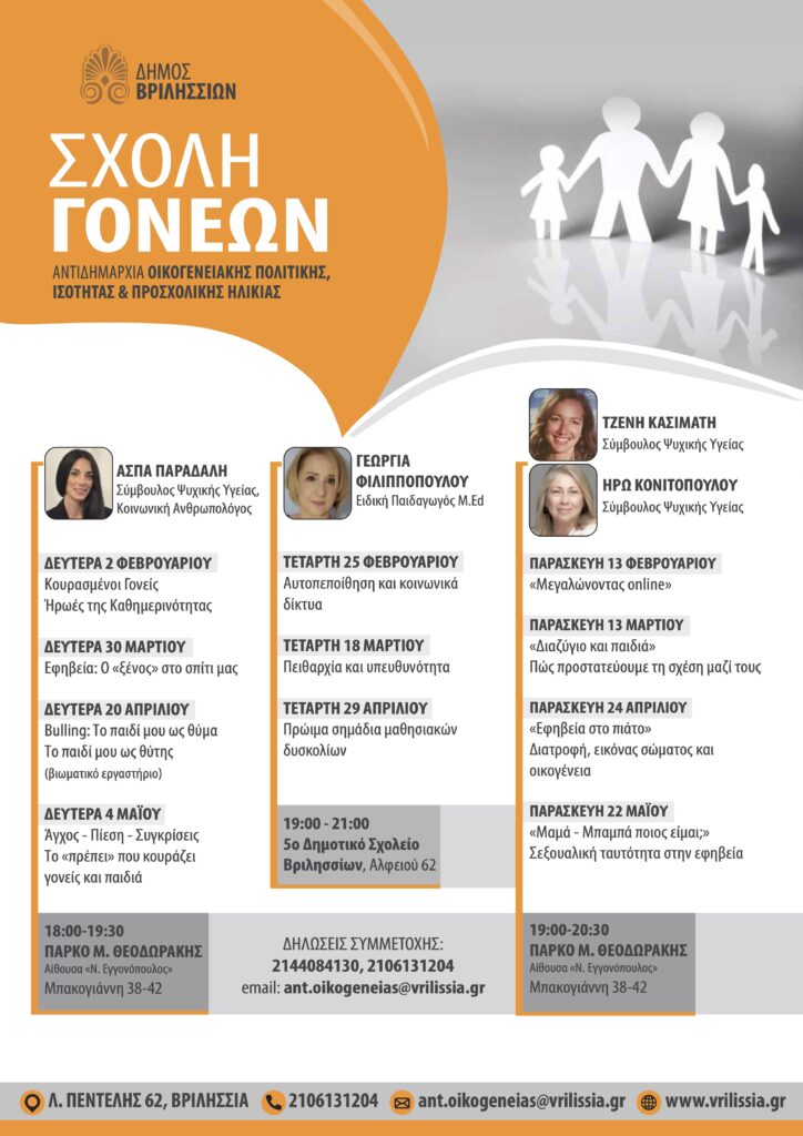 Η Σχολή Γονέων του Δήμου Βριλησσίων έρχεται να συνδράμει τους γονείς στο δύσκολο έργο τους και να τους βοηθήσει να κατανοήσουν τα προβλήματα και να δώσουν λύσεις.