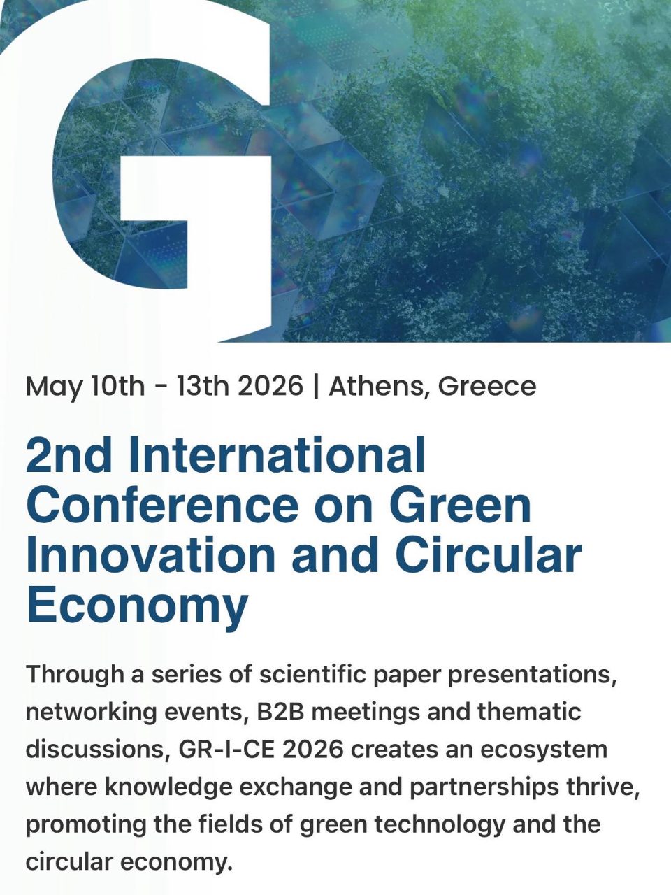 Το 2ο Διεθνές Συνέδριο για την Πράσινη Καινοτομία και την Κυκλική Οικονομία (2nd International Conference on Green Innovation and Circular Economy – GR-I-CE 2026) θα πραγματοποιηθεί στο Ίδρυμα Ευγενίδου από τις 10 έως τις 16 Μαΐου 2026.