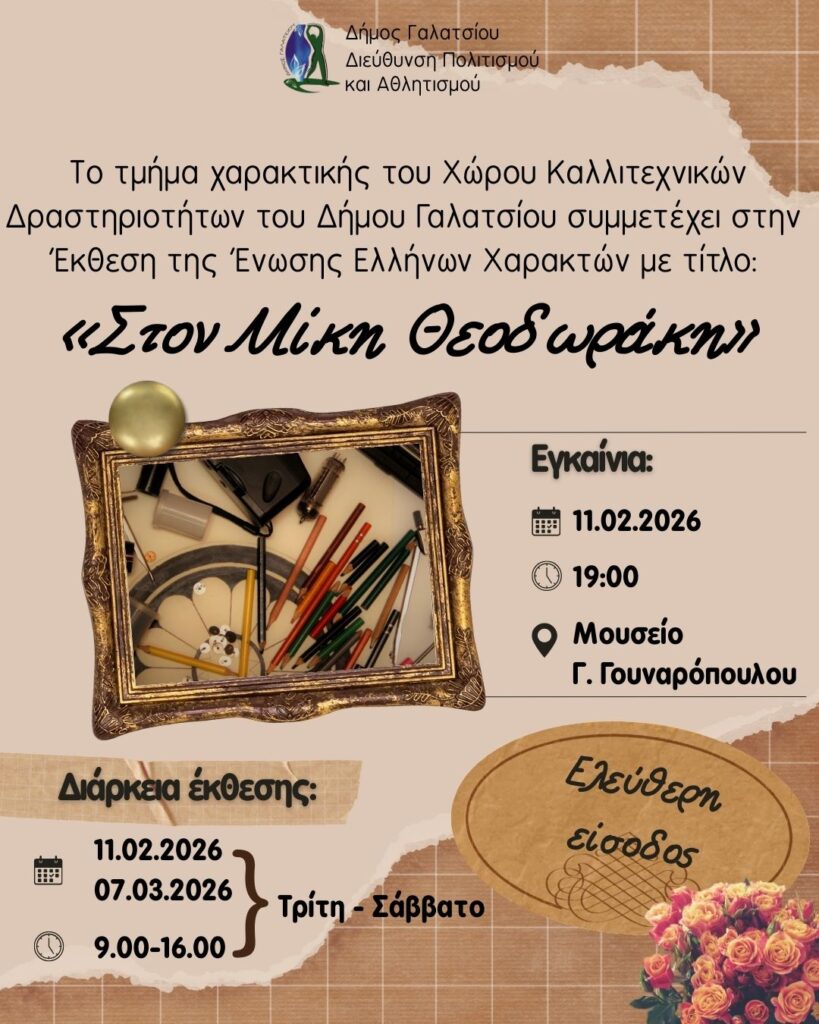 Το τμήμα χαρακτικής του Χώρου Καλλιτεχνικών Δραστηριοτήτων του Δήμου Γαλατσίου συμμετέχει στην έκθεση της Ένωσης Ελλήνων Χαρακτών με τίτλο «Στον Μίκη Θεοδωράκη», η οποία φιλοξενείται στο Μουσείο Γ. Γουναρόπουλου.