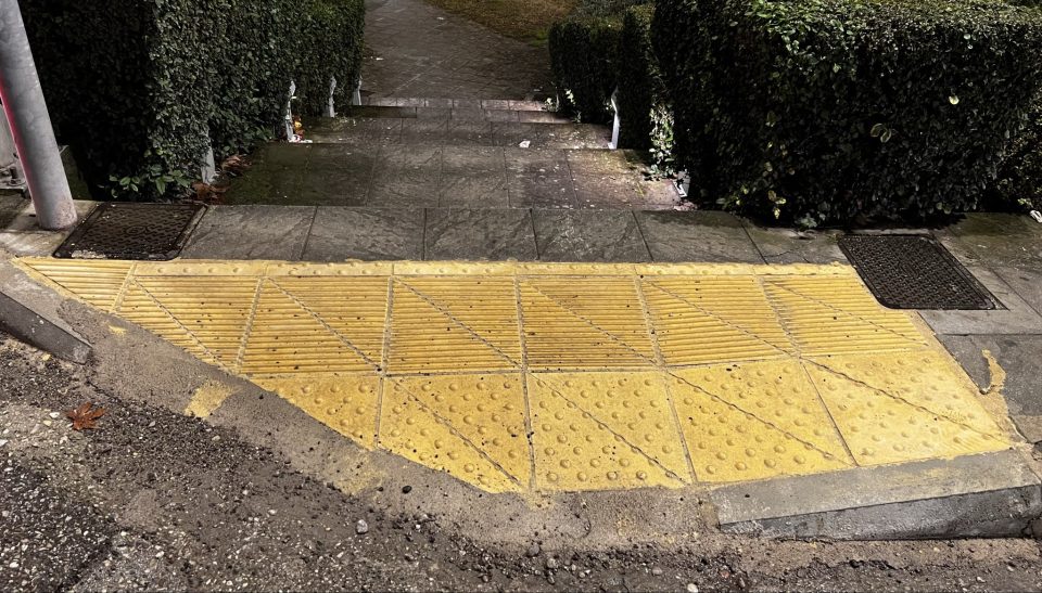Εχει κατασκευαστεί ράμπα ακριβώς δίπλα στα σκαλοπάτια που οδηγούν σε κοινόχρηστο χώρο, δημιουργώντας επικίνδυνες συνθήκες για τους ανθρώπους που έχουν κινητικά ή προβλήματα όρασης.