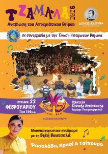 Σας προσκαλούμε να διασκεδάσουμε και να τιμήσουμε την παράδοση και να γιορτάσουμε την Αποκριά γύρω από τη φωτιά της “Τζαμάλας”.