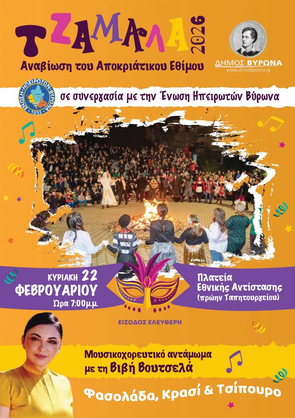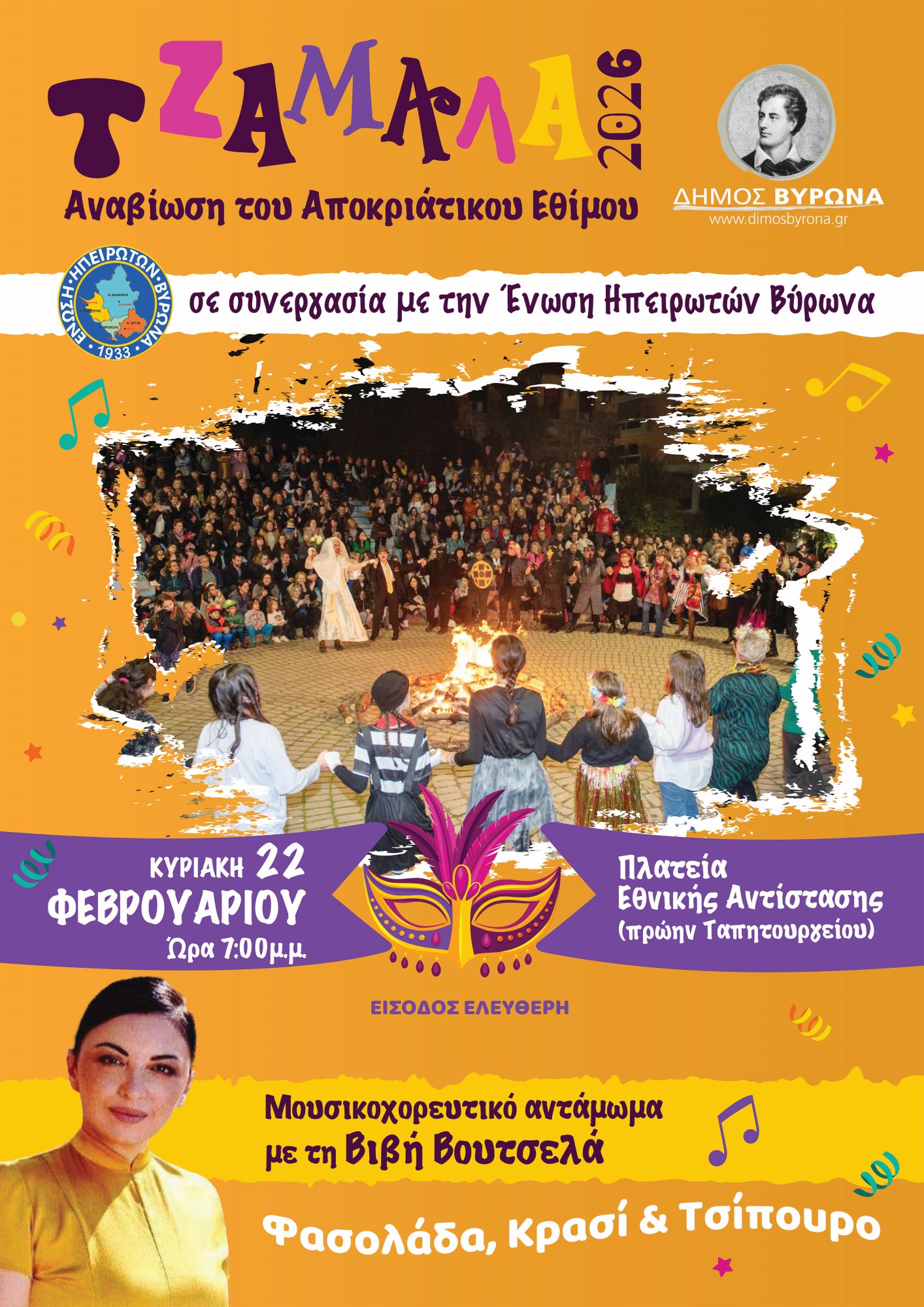 Ο Δήμος Βύρωνα, σε συνεργασία με την Ένωση Ηπειρωτών Βύρωνα, διοργανώνει την Κυριακή 22 Φεβρουαρίου 2026 και ώρα 19.00 στην πλατεία Εθνικής Αντίστασης (Ταπητουργείο), την αναβίωση του παραδοσιακού ηπειρώτικου εθίμου της «Τζαμάλας» καλώντας κατοίκους και επισκέπτες να συμμετάσχουν σε μια αυθεντική αποκριάτικη εμπειρία.