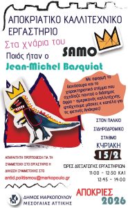 Ο χαρισματικός αφροαμερικανός καλλιτέχνης Jean – Michel Basquiat με το καλλιτεχνικό ψευδώνυμο “SAMO”, γνωστός για τα έντονα χρωματιστά σκίτσα του και τους μεγάλους καμβάδες του, αποτελεί την έμπνευση για ένα μοναδικό καλλιτεχνικό Εργαστήριο, που θα πραγματοποιηθεί στον Παλαιό Σιδηροδρομικό Σταθμό Μαρκοπούλου, την Κυριακή 15 Φεβρουαρίου 2026.