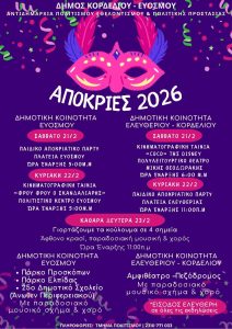 Σφυρίχτρες, σερπαντίνες, πολύχρωμες στολές, χορός, μουσική και ατελείωτο κέφι συνθέτουν το πρόγραμμα των αποκριάτικων εκδηλώσεων που διοργανώνει ο Δήμος Κορδελιού – Ευόσμου δια της Αντιδημαρχίας Πολιτισμού, Εθελοντισμού και Πολιτικής Προστασίας, προσκαλώντας μικρούς και μεγάλους σε ένα εορταστικό τριήμερο γεμάτο φαντασία, δράση και γιορτινή διάθεση.