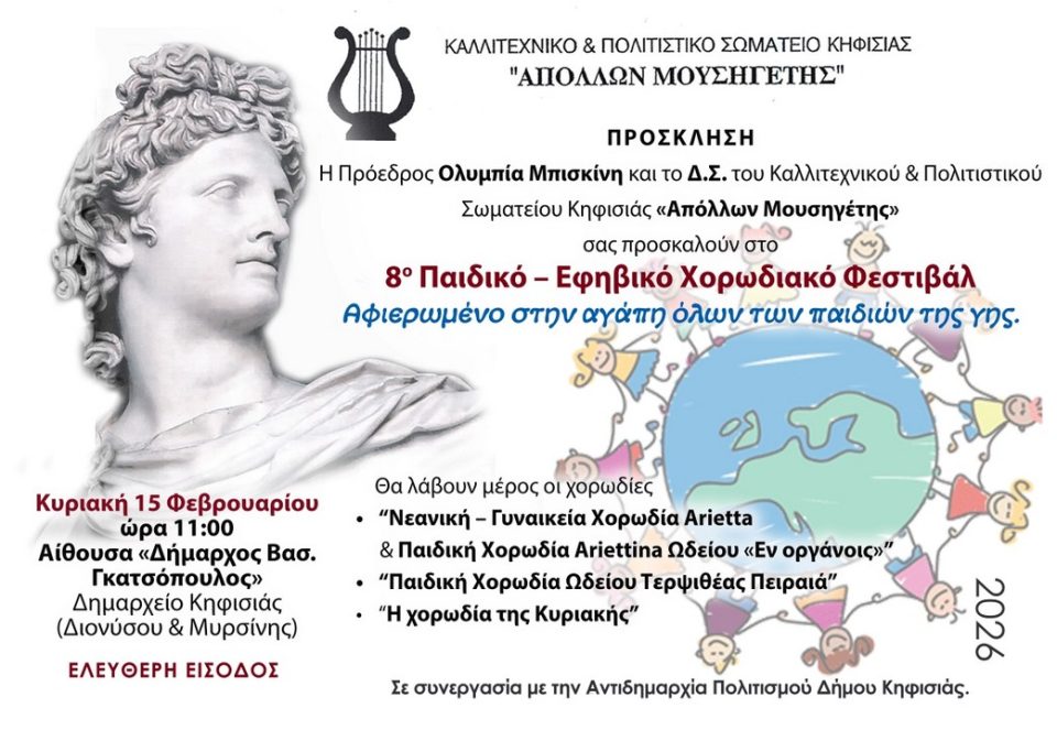Η Πρόεδρος Ολυμπία Μπισκίνη και το Δ.Σ. του Καλλιτεχνικού & Πολιτιστικού Σωματείου Κηφισιάς «Απόλλων Μουσηγέτης» σας προσκαλούν στο 8ο Παιδικό – Εφηβικό Χορωδιακό Φεστιβάλ που θα πραγματοποιηθεί .