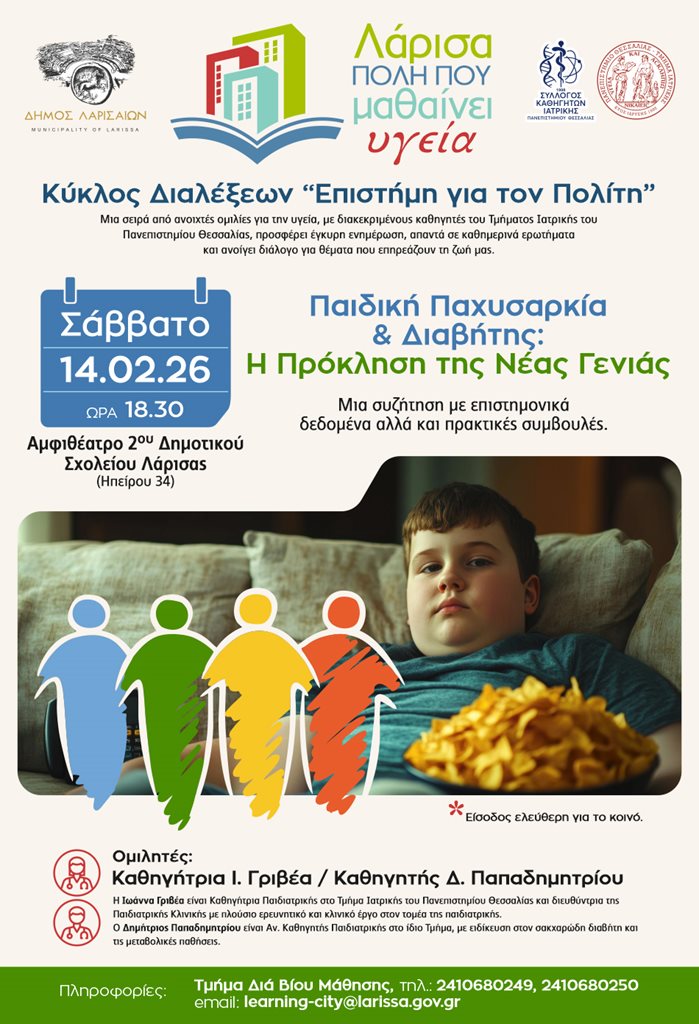 Ο Σύλλογος Καθηγητών του Τμήματος Ιατρικής του Πανεπιστημίου Θεσσαλίας και ο Δήμος Λαρισαίων συνεχίζουν τον κύκλο ανοιχτών διαλέξεων υγείας «Επιστήμη για τον Πολίτη», φέρνοντας την επιστημονική γνώση πιο κοντά σε όλους μας.