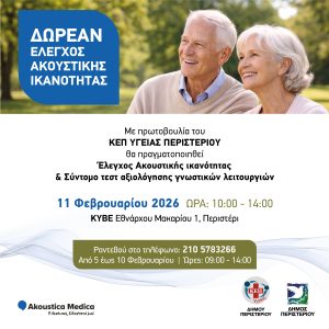 Με πρωτοβουλία του ΚΕΠ Υγείας του Δήμου Περιστερίου, διοργανώνεται δωρεάν έλεγχος ακουστικής ικανότητας και σύντομο τεστ αξιολόγησης γνωστικών λειτουργιών, στο πλαίσιο των δράσεων πρόληψης και προαγωγής της υγείας των πολιτών.
