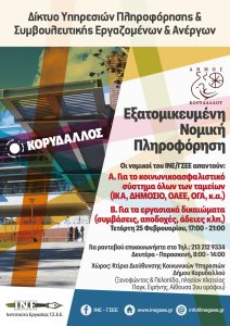 Στις 25 Φεβρουαρίου 2026, ώρες 17:00-21:00, ημέρα Τετάρτη (κατ΄εξαίρεση λόγω της αργίας της Καθαράς Δευτέρας), θα διεξαχθεί η εικοστή όγδοη δωρεάν ενημέρωση από εξειδικευμένους εργατολόγους του Ινστιτούτου Εργασίας της ΓΣΕΕ, στο δεύτερο όροφο του κτηρίου των Κοινωνικών Υπηρεσιών, Ξενοφώντος & Πελοπίδα.