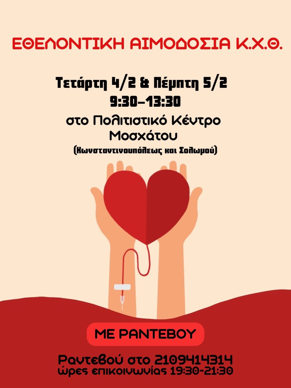 Η εθελοντική αιμοδοσία θα διεξαχθεί την Τετάρτη 4 και την Πέμπτη 5 Φεβρουαρίου 2026, από τις 09.30 έως τη 13.30 στο Πολιτιστικό Κέντρο «Θεόδωρος Αγγελόπουλος» στο Μοσχάτο (Κωνσταντινουπόλεως και Σολωμού). Το αίμα που θα συγκεντρωθεί θα ενισχύσει την τράπεζα αίματος του Δήμου Μοσχάτου-Ταύρου.