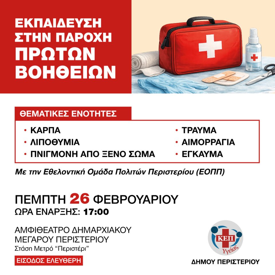 Το ΚΕΠ Υγείας Δήμου Περιστερίου, σε συνεργασία με την Εθελοντική Ομάδα Πολιτών Περιστερίου (ΕΟΠΠ), διοργανώνει εκπαιδευτική δράση στην παροχή Πρώτων Βοηθειών, με στόχο την ενημέρωση και την πρακτική εκπαίδευση των πολιτών σε κρίσιμες καταστάσεις έκτακτης ανάγκης.
