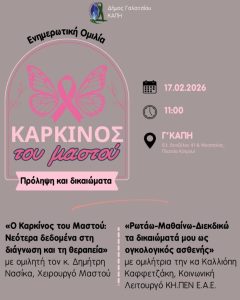 Τα ΚΑΠΗ Γαλατσίου, σε συνεργασία με την Ελληνική Αντικαρκινική Εταιρεία, σας προσκαλούν σε ενημερωτική ομιλία την Τρίτη 17 Φεβρουαρίου, στις 11:00 π.μ., στο Γ΄ ΚΑΠΗ Γαλατσίου (Ελ. Βενιζέλου 41 & Μεσσηνίας, Πλατεία Κύπρου)