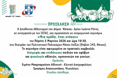 H Διεύθυνση Αθλητισμού Δήμου Νίκαιας- Αγίου Ιωάννη Ρέντη, σε συνεργασία με τον ΣΕΓΑΣ, διοργανώνει ενημερωτικό σεμινάριο με τίτλο «Μια ομάδα, ένας στόχος», την Πέμπτη 5 Μαρτίου και ώρα 19:30, στο Θεατράκι του Πολιτιστικού Πολυχώρου Μάνος Λοΐζος ( Θηβών 245, Νίκαια).
