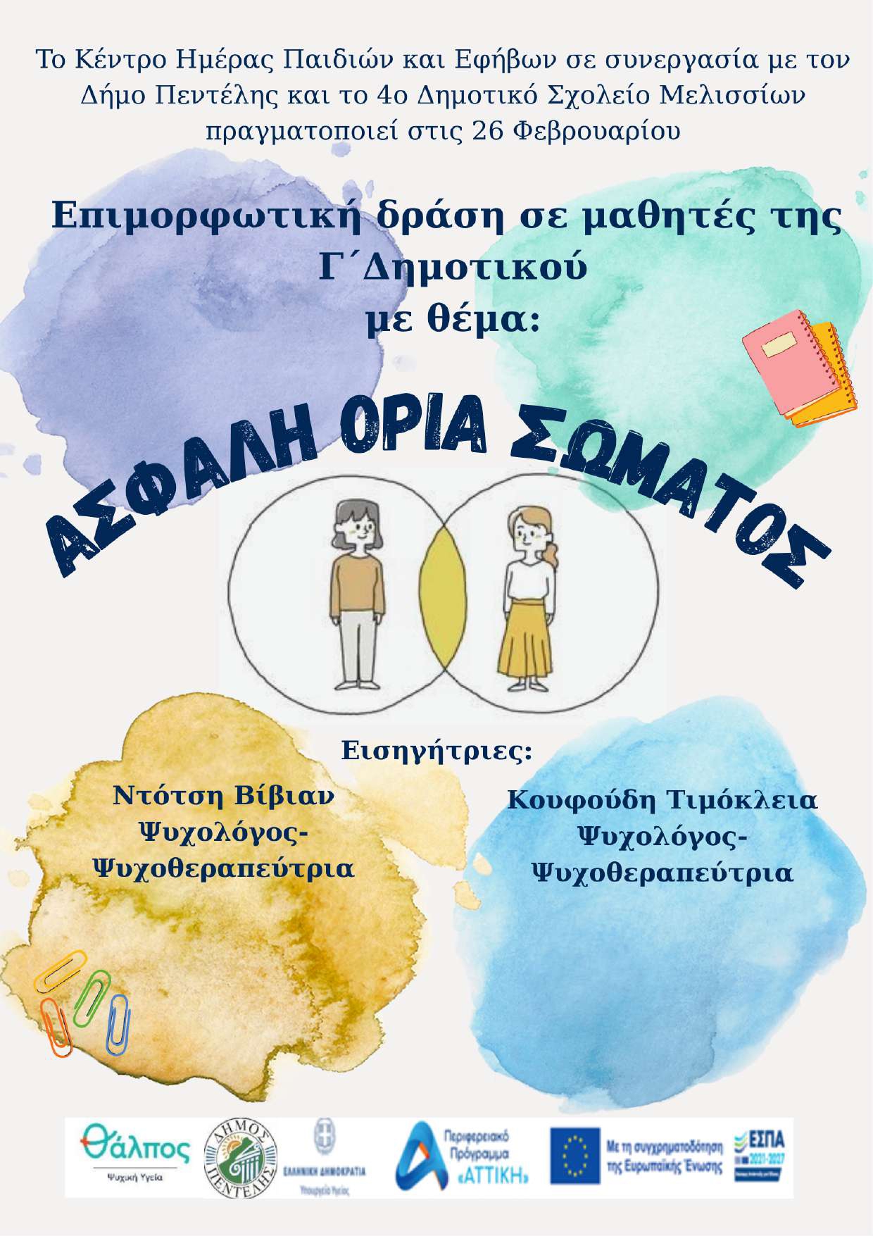 Την Πέμπτη 26/2, το Κέντρο Ημέρας Παιδιών και Εφήβων ΘΑΛΠΟΣ, σε συνεργασία με τον Δήμο Πεντέλης και το 4ο Δημοτικό Σχολείο Μελισσίων πραγματοποιούν επιμορφωτική δράση για τους μαθητές και τις μαθήτριες της Γ΄ τάξης με τίτλο:
