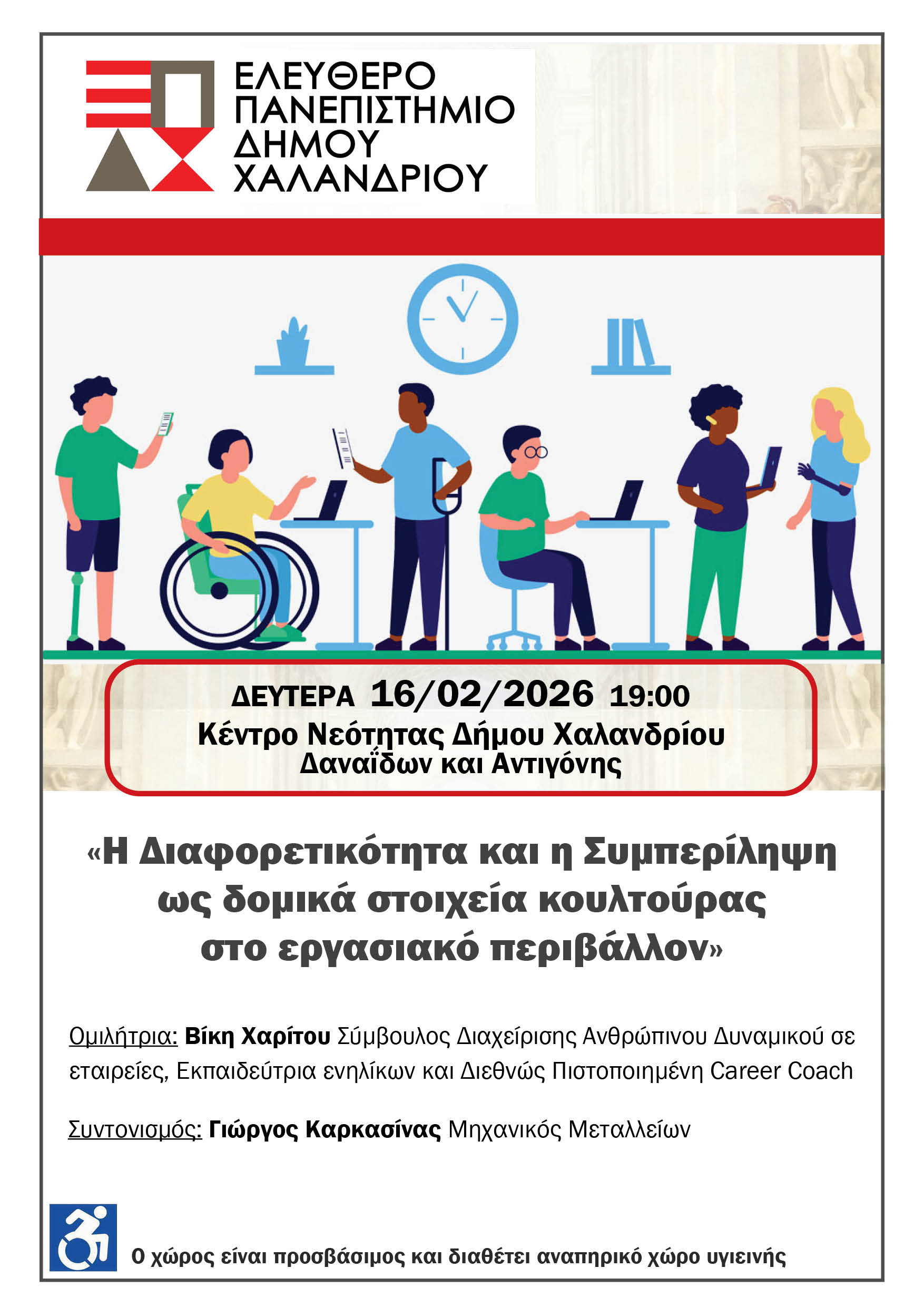 Τη Δευτέρα 16/02/2026 και ώρα 19:00 στο Κέντρο Νεότητας (Δαναΐδων & Αντιγόνης) το Ελεύθερο Πανεπιστήμιο του Δήμου Χαλανδρίου φιλοξενεί μια πάρα πολύ επίκαιρη και σπουδαίας σημασίας διάλεξη, με θέμα: «Η Διαφορετικότητα και η Συμπερίληψη ως δομικά στοιχεία κουλτούρας στο εργασιακό περιβάλλον».