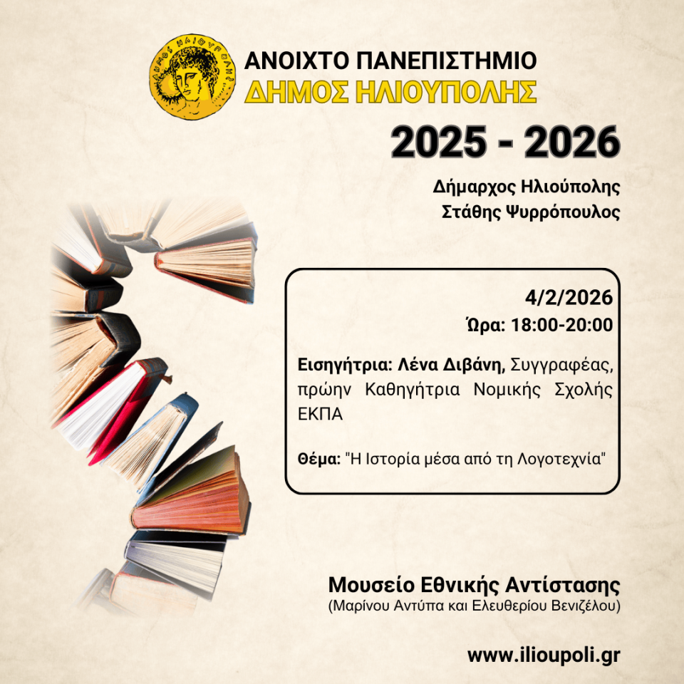 10η ομιλία του Ανοιχτού Πανεπιστημίου την Τετάρτη 4 Φεβρουαρίου 2026 και ώρα 18:00-20:00, στο Μουσείο Εθνικής Αντίστασης (Μαρίνου Αντύπα και Ελευθερίου Βενιζέλου) με Εισηγήτρια την Λένα Διβάνη, Συγγραφέας, πρώην Καθηγήτρια Νομικής Σχολής ΕΚΠΑ και θέμα: «Η Ιστορία μέσα από τη Λογοτεχνία».