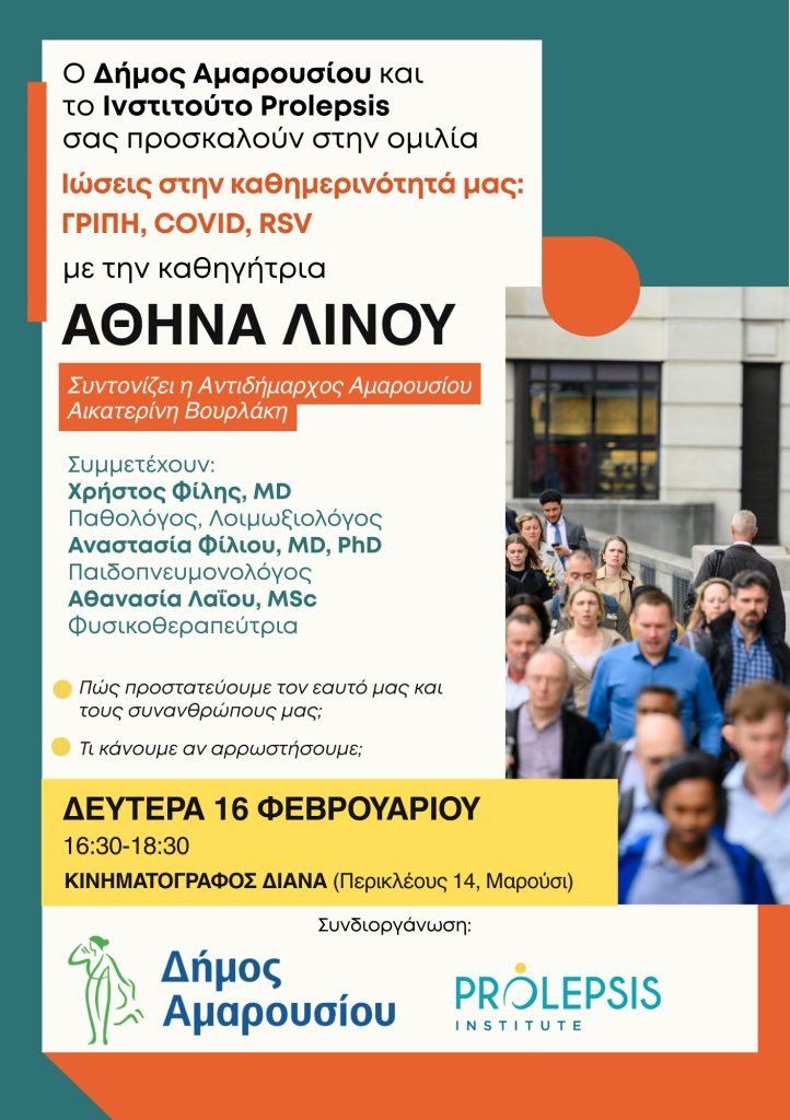 Ο Δήμος Αμαρουσίου και το Ινστιτούτο Prolepsis σας προσκαλούν στην ομιλία «Ιώσεις στην καθημερινότητά μας: ΓΡΙΠΗ, COVID, RSV», με την Καθηγήτρια Επιδημιολογίας ΕΚΠΑ Αθηνά Λινού 👩‍⚕️.