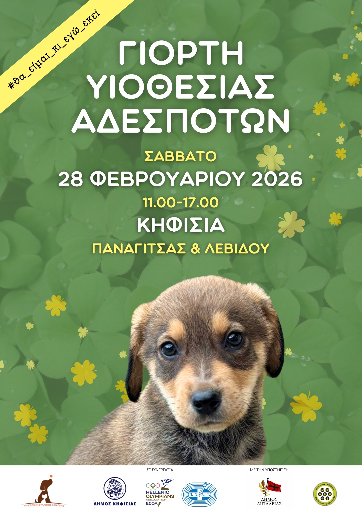 Με ιδιαίτερη χαρά σας προσκαλούμε το Σάββατο, 28 Φεβρουαρίου 2026, στο κέντρο της Κηφισιάς, στη συμβολή των οδών Παναγίτσας και Λεβίδου, σε μια μεγάλη γιορτή υιοθεσίας αδέσποτων ζώων, που πραγματοποιείται σε συνεργασία με το Φιλοζωικό Σύλλογο Αιγιαλείας, από τις 11:00 π.μ. – 17:00 μ.μ..