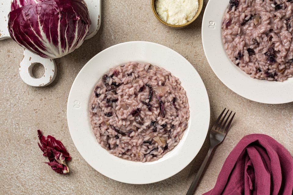 Αρχικά ρίχνουμε το λάχανο, στη συνέχεια το μωβ λάχανο και μετά το ρύζι.