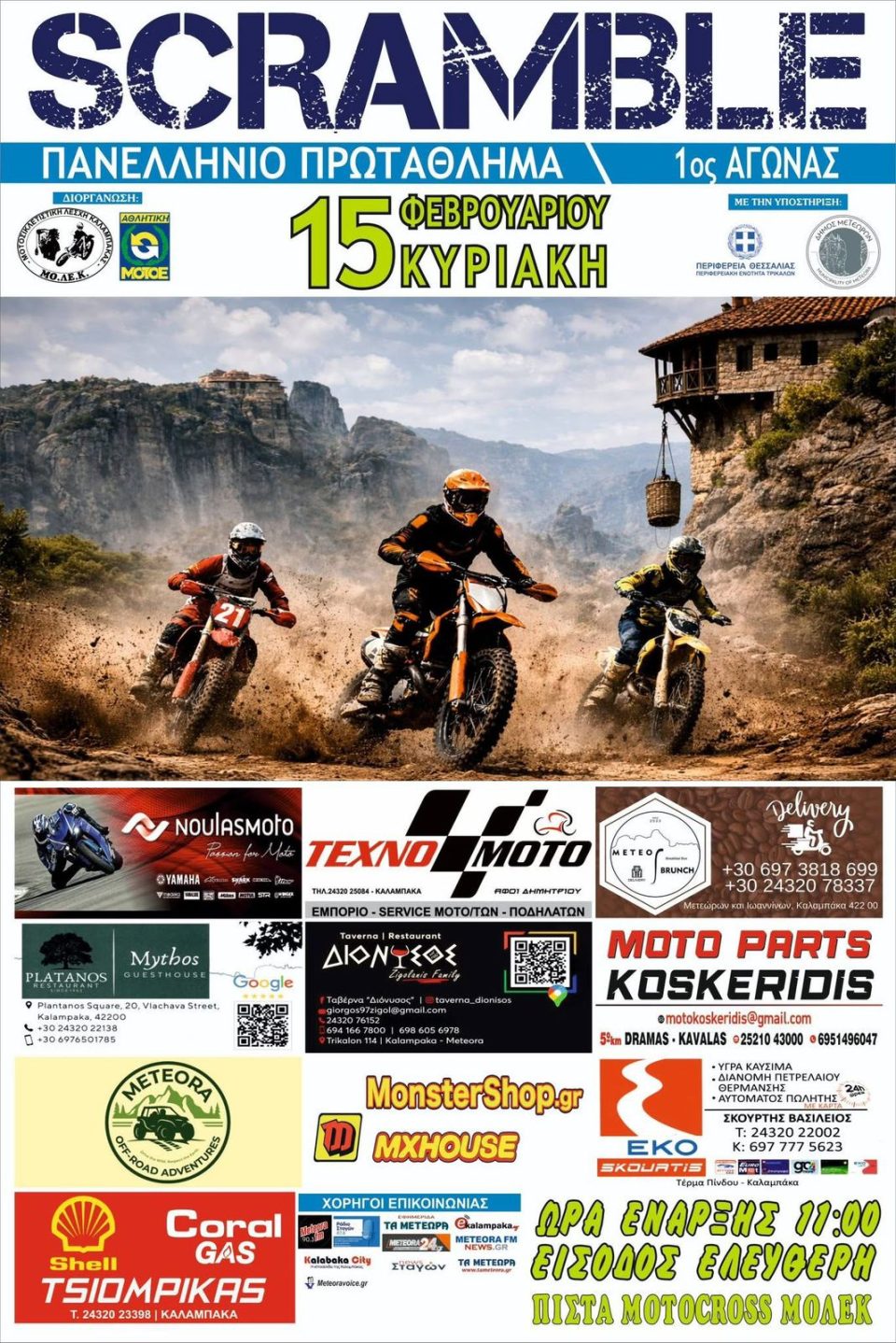 Ο Δήμος Μετεώρων ανακοινώνει με ιδιαίτερη χαρά τη στήριξή του στη διοργάνωση του 1ου Αγώνα του Πανελληνίου Πρωταθλήματος SCRAMBLE, που θα πραγματοποιηθεί την Κυριακή 15 Φεβρουαρίου 11:00, π.μ. στην πίστα Motocross ΜΟ.ΛΕ.Κ., στη Σαρακίνα Καλαμπάκας.