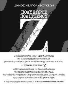 Τον καταξιωμένο Έλληνα σκηνοθέτη Κώστα Γαβρά θα τιμήσει την ερχόμενη Παρασκευή, 13 Φεβρουαρίου 2026, στι 7 μ.μ., ο δήμος Νεάπολης-Συκεών μετονομάζοντας σε «Πολυχώρο Πολιτισμού Ζ» την «Μεταξοϋφαντουργία Κωνσταντινίδη-Ήλιος», που βρίσκεται στον αριθμό 120 της λεωφόρου Μίκης Θεοδωράκης (πρώην Λαγκαδά).