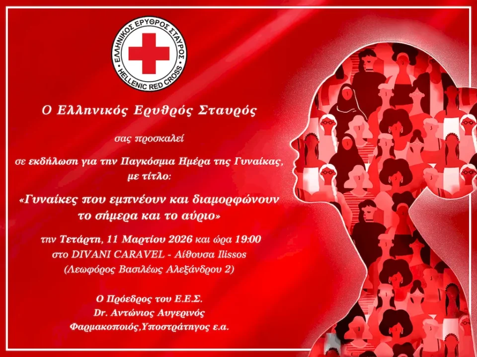 Ο Ελληνικός Ερυθρός Σταυρός (Ε.Ε.Σ.), με αφορμή την Παγκόσμια Ημέρα της Γυναίκας (8/3), διοργανώνει εορταστική εκδήλωση, την Τετάρτη 11 Μαρτίου 2026 και ώρα 19:00, στο ξενοδοχείο Divani Caravel (Αίθουσα Ιλισσός), με τίτλο: “Γυναίκες που εμπνέουν και διαμορφώνουν το σήμερα και το αύριο“, η οποία είναι αφιερωμένη σε γυναίκες που με τη διαδρομή και την προσφορά τους εμπνέουν και διαμορφώνουν θετικά το κοινωνικό αποτύπωμα της εποχής μας στην Ελλάδα.