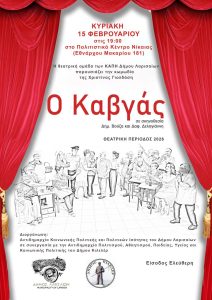 Η θεατρική ομάδα του Τμήματος ΚΑΠΗ, της Αντιδημαρχίας Κοινωνικής Πολιτικής και Πολιτικών Ισότητας του Δήμου Λαρισαίων, παρουσιάζει την κωμωδία «Ο Καβγάς» της Χριστίνας Γιολδάση-Τσιαούση. Η παράσταση ανεβαίνει στο Πολιτιστικό Κέντρο Νίκαιας (Εθνάρχου Μακαρίου 181) την Κυριακή 15 Φεβρουαρίου 2026, στις 19:00. Τη σκηνοθεσία υπογράφουν ο Δημήτρης Βούζας και η Δάφνη Δεληγιάννη.