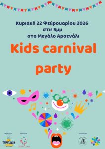 Την Κυριακή 22 Φεβρουαρίου 2026 και ώρα 17.00 στο Μεγάλο Αρσενάλι καλούμε τους μικρούς μασκαράδες σε ένα ξέφρενο παιδικό αποκριάτικο πάρτυ με τον κλόουν Λόκο.