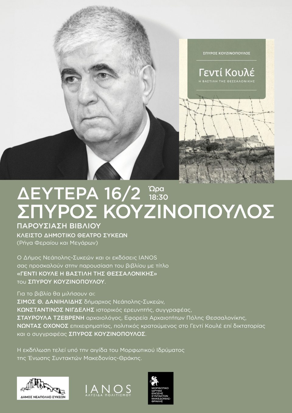 Η παρουσίαση του βιβλίου θα γίνει τη Δευτέρα 16 Φεβρουαρίου 2026, στις 6:30 μ.μ., στο Κλειστό Δημοτικό Θέατρο Συκεών (Ρήγα Φεραίου και Μεγάρων), με ελεύθερη είσοδο για το κοινό. Για το βιβλίο, δε, θα μιλήσουν οι: