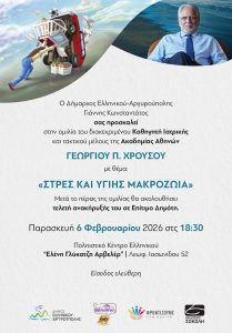Ο Δήμαρχος Ελληνικού – Αργυρούπολης Γιάννης Κωνσταντάτος σας προσκαλεί σε μία ιδιαίτερα επίκαιρη και ουσιαστική ομιλία με τίτλο «Στρες και Υγιής Μακροζωία», την Παρασκευή 6 Φεβρουαρίου 2026, στις 18:30, στο Πολιτιστικό Κέντρο Ελληνικού «Ελένη Γλύκατζη Αρβελέρ» (Λ. Ιασωνίδου 52, Ελληνικό).