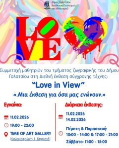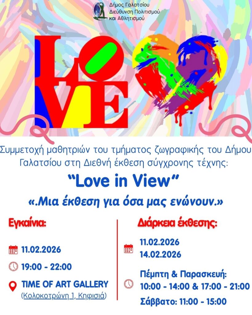 Μαθήτριες του τμήματος ζωγραφικής του Χώρου Καλλιτεχνικών Δραστηριοτήτων συμμετέχουν στη Διεθνή Έκθεση Σύγχρονης Τέχνης “Love in View”, «.Μια έκθεση για όσα μας ενώνουν.», που θα πραγματοποιηθεί στην Time of Art Gallery, στην Κηφισιά, από την Τετάρτη 11 Φεβρουαρίου έως το Σάββατο 14 Φεβρουαρίου 2026.