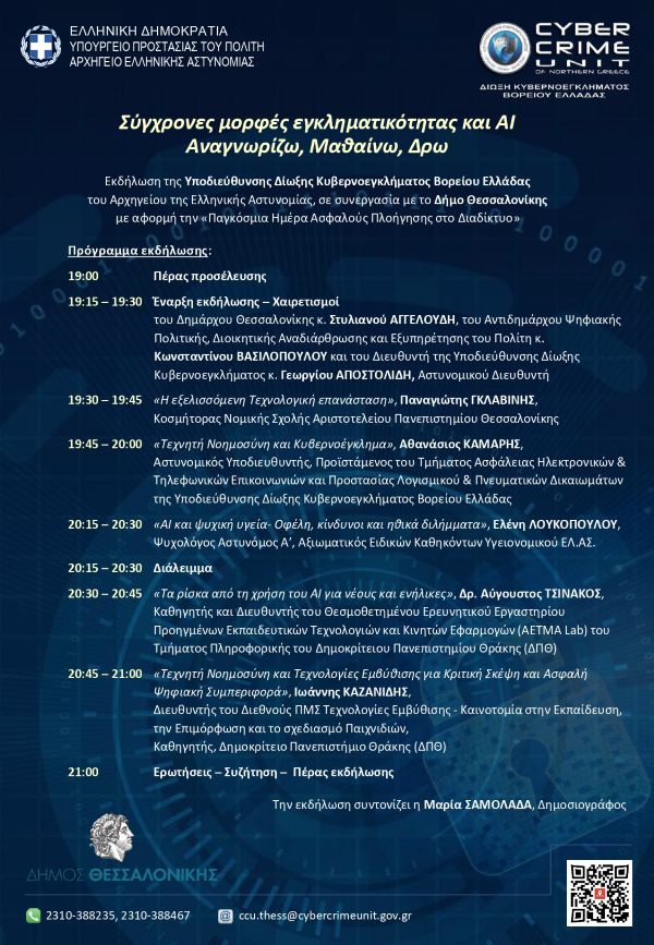 Εκδήλωση με θέμα «Σύγχρονες μορφές εγκληματικότητας και ΑΙ – Αναγνωρίζω, Μαθαίνω, Δρω» διοργανώνουν ο Δήμος Θεσσαλονίκης, η Αντιδημαρχία Ψηφιακής Πολιτικής, Διοικητικής Αναδιάρθρωσης & Εξυπηρέτησης του Πολίτη και η Υποδιεύθυνση Δίωξης Κυβερνοεγκλήματος Βορείου Ελλάδας του Αρχηγείου της Ελληνικής Αστυνομίας, με αφορμή την Παγκόσμια Ημέρα Ασφαλούς Πλοήγησης στο Διαδίκτυο.