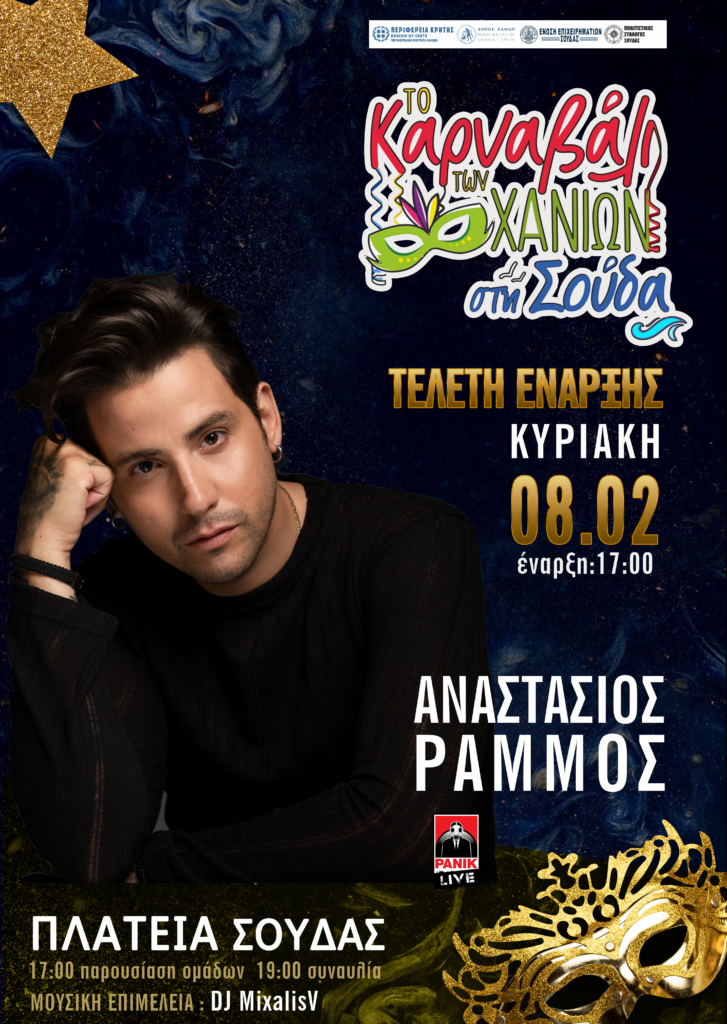 Μετράμε αντίστροφα για την τελετή έναρξης του Χανιώτικου Καρναβαλιού 2026, η οποία θα πραγματοποιηθεί την Κυριακή 08 Φεβρουαρίου 2026, στις 17.00, στο Κλειστό Δημοτικό Γυμναστήριο Σούδας, με τον Βασιλιά Καρνάβαλο να κάνει την εμφάνιση του στις 17:00 με επιλεγμένες καρναβαλικές μουσικές από τον dj Μιχάλη Βλαμάκη, ενώ θα ακολουθήσει μεγάλη συναυλία με το συγκρότημα του Αναστασίου Ράμμου, στις 19:00.