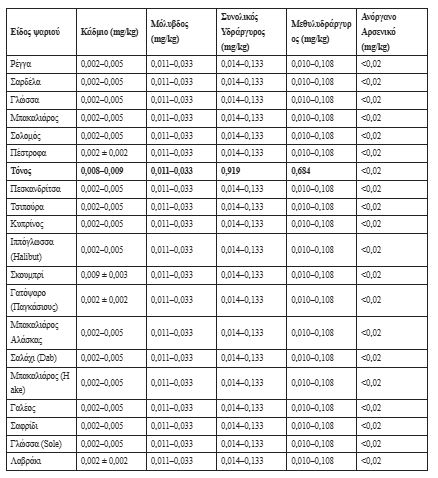 Ο παρακάτω συγκεντρωτικός πίνακας δείχνει τα 20 είδη ψαριών που εξετάστηκαν στην πολωνική μελέτη, με τις συγκεντρώσεις των βαρέων μετάλλων που μετρήθηκαν: