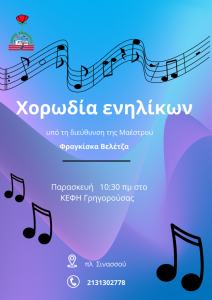 Ο Δήμος Χαϊδαρίου, στο πλαίσιο των δράσεων του για τα ΚΕΦΗ (πρώην ΚΑΠΗ), οργανώνει ομάδα Χορωδίας Ενηλίκων, υπό τη διεύθυνση της μουσικού κ. Φραγκίσκας Βελέντζα.