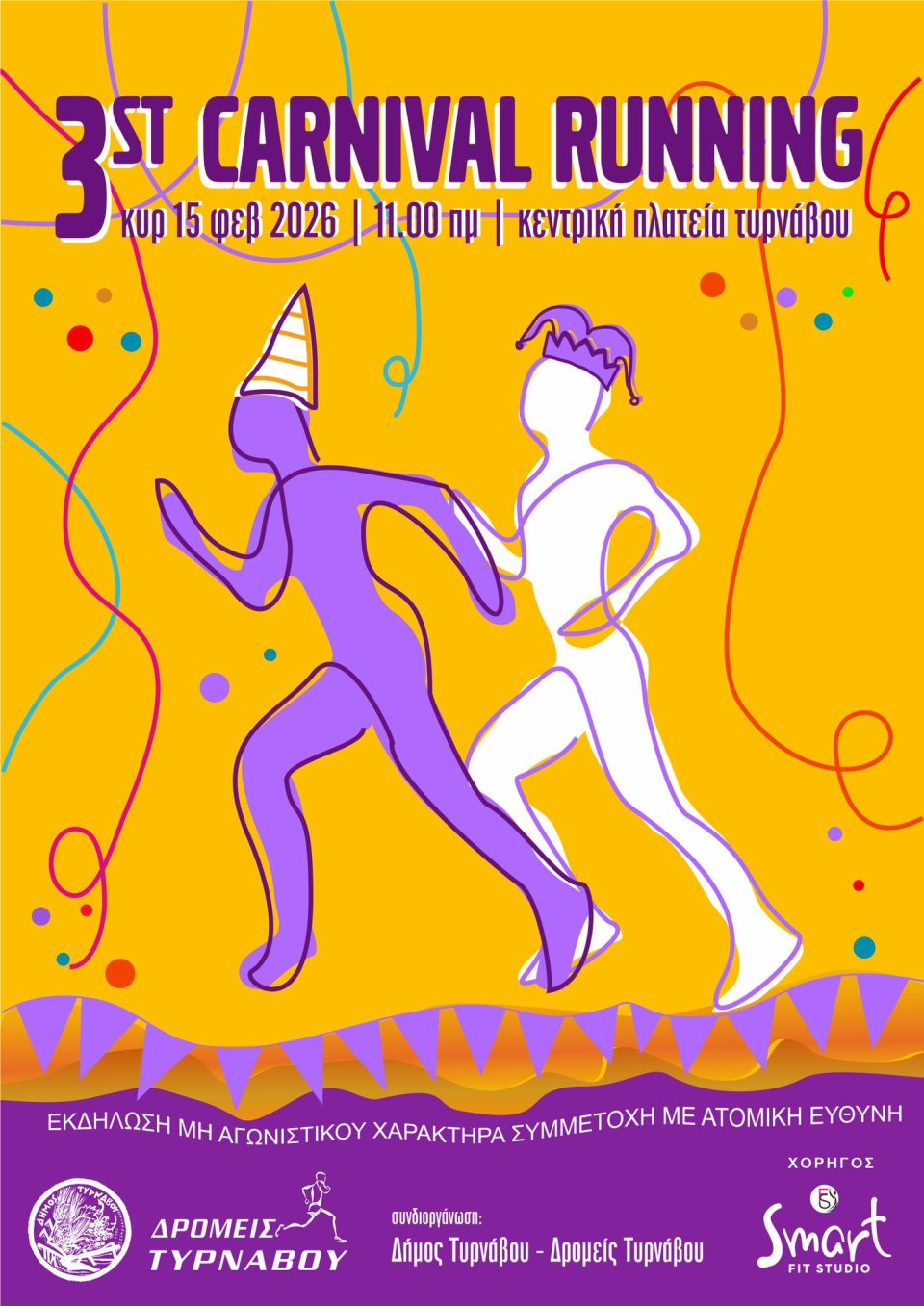Στο πλαίσιο των αποκριάτικων εκδηλώσεων του Δήμου Τυρνάβου θα πραγματοποιηθεί το 3rd Carnival Run την Κυριακή 15 Φεβρουαρίου 2026 στον Τύρναβο, σε συνδιοργάνωση με τους Δρομείς Τυρνάβου.