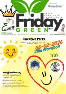 Ο Δήμος Θεσσαλονίκης και η Ε΄ Δημοτική Κοινότητα, σε συνδιοργάνωση με τον Πολιτιστικό Οργανισμό Μακεδονίας – Θράκης «Εσαεί εν Ροή», διοργανώνουν ανοιχτή εκδήλωση στο πλαίσιο της Green Friday, με στόχο τη διάχυση των αποτελεσμάτων της καμπάνιας για τα αδέσποτα ζώα.