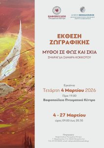 Έκθεση ζωγραφικής της Σμαράγδας Σαμαρά-Κοκκοτού με τίτλο «ΜΥΘΟΙ ΣΕ ΦΩΣ ΚΑΙ ΣΚΙΑ» διοργανώνει το Βαφοπούλειο Πνευματικό Κέντρο από 4 έως 27 Μαρτίου 2026.