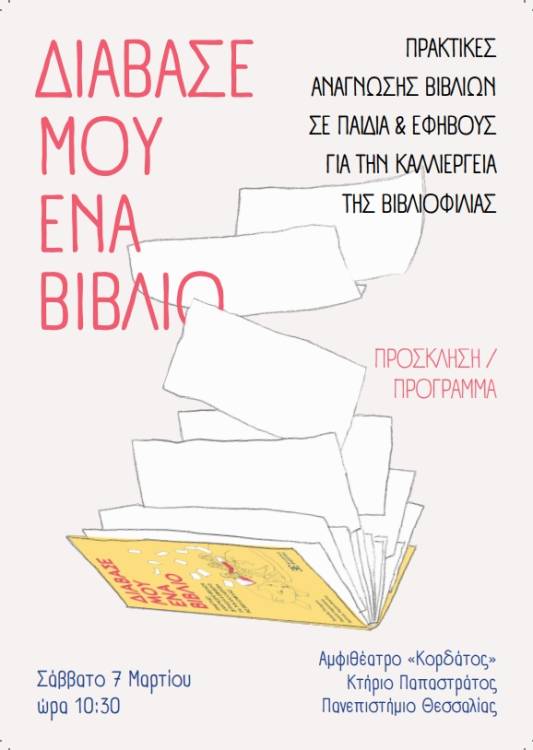 «Διάβασέ μου ένα βιβλίο» τιτλοφορείται η εκδήλωση που διοργανώνεται το Σάββατο 7 Μαρτίου στις 10:30 στο αμφιθέατρο «Κορδάτος» του κτηρίου Παπαστράτος του Πανεπιστημίου Θεσσαλίας, όπου θα δοθούν πρακτικές για την ανάγνωση βιβλίων σε παιδιά και εφήβους με στόχο την καλλιέργεια της βιβλιοφιλίας.