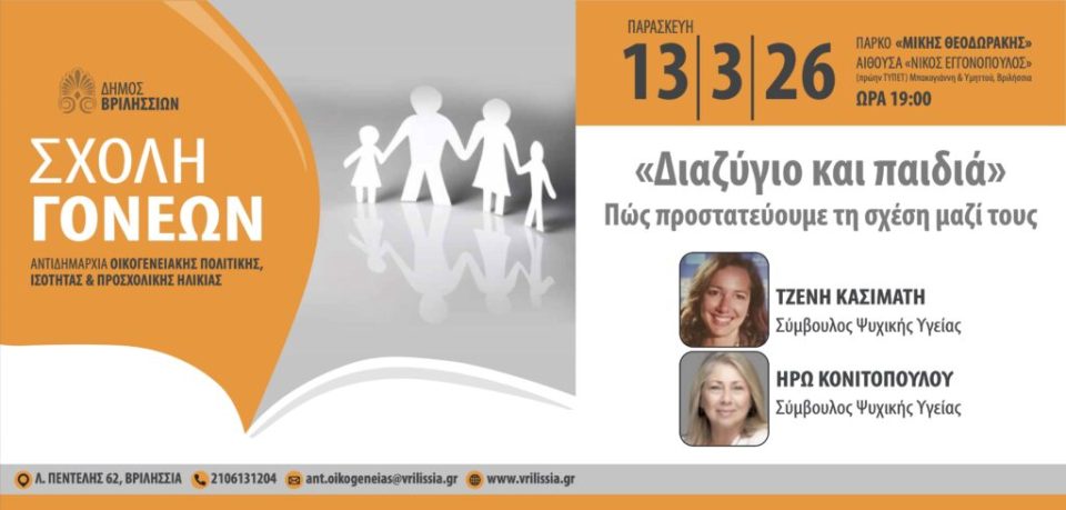 Αφιερωμένη στο πώς βιώνουν τα παιδιά το διαζύγιο και τι μπορούν να κάνουν οι γονείς για να τα βοηθήσουν να νιώσουν ασφάλεια και σταθερότητα είναι η προσεχής συνάντηση της Σχολής Γονέων του Δήμου Βριλησσίων την Παρασκευή 13/03/2026 και ώρα 19:00 στο πάρκο Μ. Θεοδωράκης (πρ. ΤΥΠΕΤ).