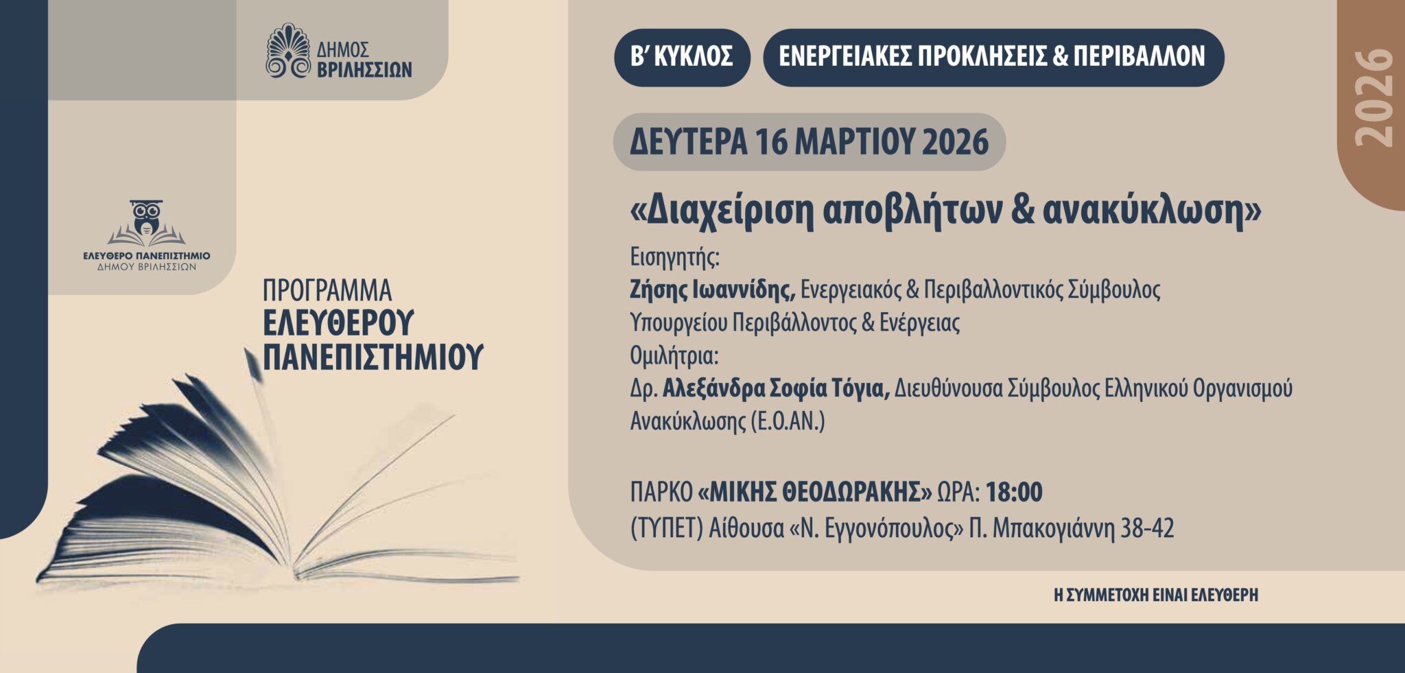 Η εκδήλωση θα πραγματοποιηθεί τη Δευτέρα 16 Μαρτίου 2026 και ώρα 18:00, στο Πάρκο «Μίκης Θεοδωράκης» (ΤΥΠΕΤ), στην αίθουσα «Ν. Εγγονόπουλος», Π. Μπακογιάννη 38–42.